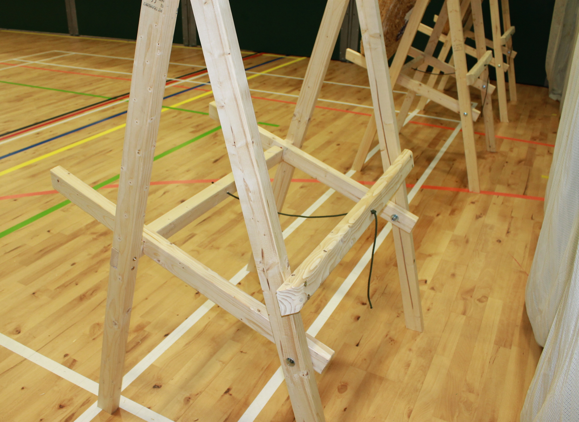Several complete stands, note the safety cord which is not meant to be taut - the support arms define the exact angle.
