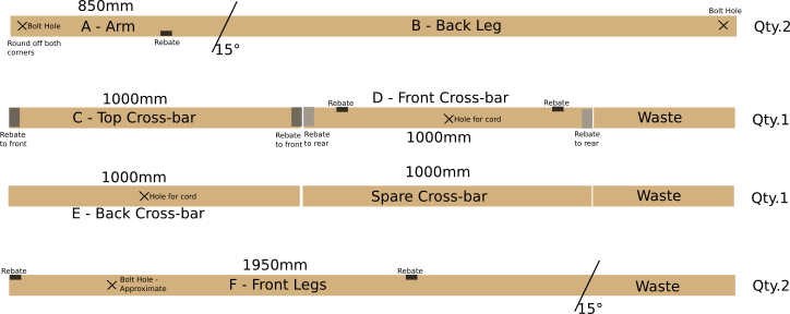 Fashion a rebate of approx. 25mm to the top of the front legs (Part F) and a matching rebate to either end of top cross-bar C.
